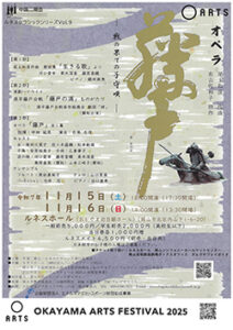 中国二期会 オペラ「藤戸」─戦の果ての子守唄─有吉佐和子原作・尾上和彦作曲 が、11月15日〔土〕午後6時からと16日〔日〕午後2時から、ルネスホール(岡山市北区内山下、おかやま旧日銀ホール)で開催される。
