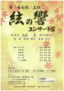 筝・十七絃・三絃 絃の響コンサート5 が、11月23日〔日・祝〕午後2時から、ふくやま芸術文化ホール・リーデンローズ(福山市松浜町、電084・928・1800)小ホールで開催される。入場無料(要チケット)