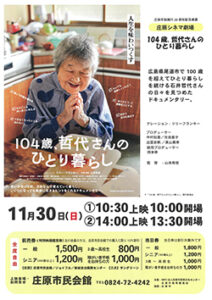 庄原シネマ劇場「104歳、哲代さんのひとり暮らし」上映会が、11月30日〔日〕午前10時30分からと午後2時から、庄原市民会館(庄原市西本町、電0824・72・4242)で開催される。