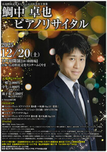 鯛中卓也ピアノリサイタル12/20、県民文化Cふくやま 2025年12月10日号 鯛中卓也 ピアノリサイタル が、12月20日〔土〕午後6時30分から、広島県民文化センターふくやま(福山市東桜町、電084・921・9200)で開催される。 プログラムは、ベートーヴェン:ピアノソナタ第8番ハ短調Op.13「悲愴」、J.S.バッハ:2声のインヴェンション(全15曲)BWV772-786ほか。入場料は、一般2千円、高校生以下1千円、親子券2500円、当日各500円増。 « 前のページ 次のページ »