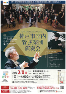神戸市室内管弦楽団演奏会3/8、倉敷市芸文館 2026年02月10日号 神戸市室内管弦楽団演奏会が、3月8日〔日〕午後3時から、倉敷市芸文館(倉敷市中央、電086・434・0400)ホールで開催される。プログラムは、シューベルト:歌劇「サラマンカの友人たち」D326-序曲、ベートーヴェン:ピアノ協奏曲第1番ハ長調作品15、シューベルト:交響曲第8番ハ長調D944《ザ・グレート》。料金は、前売一般4千円、大学生以下500円(当日各500円増)。 « 前のページ 次のページ »