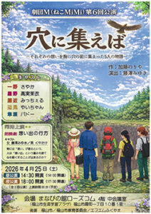 劇団M(ねこMiMi)第6回公演「穴に集えば」─それぞれの想いを胸に穴の前に集まった5人の物語─(作:加藤のりや、演出:藤澤みゆき)が、4月25日〔土〕昼公演=午後2時30分から、夜公演=同6時から、まなびの館ロ-ズコム(福山市霞町、電084・932・7265)4階中会議室で開催される。