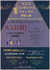ビンゴ コンボジャズ フォーラムVOL.26 が、4月12日〔日〕午前11時30分から午後5時まで、アイネスフクヤマ(福山市東桜町)1Fセンタープラザで開催される。鑑賞無料。