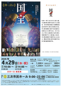映画「国宝」上映会4/29、三次市民ホール 2026年04月10日号 映画「国宝」上映会が、4月29日〔水・祝〕午前10時からと午後2時から、三次市民ホール(三次市三次町、電0824・62・2222)で開催される。 料金は、前売り一般1500円、(当日1800円)、高校生以下800円(同1千円)、シニア(60歳以上)1200円(同1300円)、障がい者手帳持参1千円。 « 前のページ 次のページ »