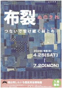 布裂(ぬのきれ)つないで受け継ぐ絲と布4/25から、しんいち歴史民博館 2026年04月20日号 布裂(ぬのきれ)つないで受け継ぐ絲と布 が、4月25日〔土〕から7月20日〔月〕まで、福山市しんいち歴史民俗博物館(福山市新市町、電0847・52・2992)で開催される。入場無料。 幾度も再生を繰り返し伝えられた「糸」と「布」から、布を最後まで十分に生かし切る知恵と技術など、新古の布の色合いの美しさや力強さを見て頂きたい。 « 前のページ 次のページ »