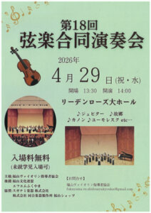 第18回 弦楽合同演奏会4/29、リーデンローズ 2026年04月20日号 第18回 弦楽合同演奏会 が、4月29日〔水・祝〕午後2時から、ふくやま芸術文化ホール・リーデンローズ(福山市松浜町、電084・928・1800)大ホールで開催される。入場無料(未就学児入場可)。 プログラムは、ジュピター、故郷、カノン、ユーモレスクほか。福山ヴァイオリン指導者協会が主催する。 « 前のページ 次のページ »