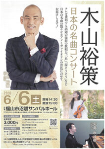 木山裕策─日本の名曲コンサート─が、6月6日〔土〕午後3時から、福山市沼隈サンパルホール(福山市沼隈町、電084・987・1866)で開催される。