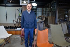 1952年創業の岡本テキスタイルを営む。旧式力織機による希少なレプリカデニムの製造を国内外の職人と共に行い、世界のレプリカメーカーから高く評価されている。このほど、19世紀のイギリスの発明家が開発した独自の構造の折り畳み椅子の復刻ブランド「Paragon Camp Furniture」を立ち上げ、11月からECサイトで販売する。