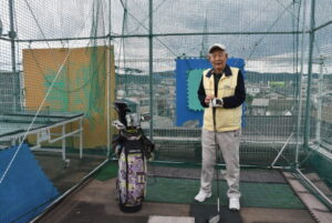 自宅のゴルフ練習場でゴルフクラブを持つ児玉相談役