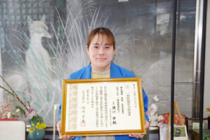 2019年年に入社し、主に「レンタル額」(貸し額)を担当した。布を貼り、作品を貼って仕上げる。いわば作品が「映える」ように化粧する仕事である。実務経験を経てスキルアップを目指して2021年、2級表装技能士を受験し見事合格する。