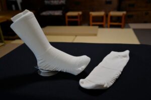 高齢者の転倒予防のために広島大学との共同研究で開発された商品で、サイズ別展開していたが、このほどワンサイズにリニューアル。特殊な等間隔のタック網を施して、つま先部分が上がることから、つまづきによる転倒を予防することが出来るという。福山市ではダ・カーポでのみ取り扱いをしており、開発者で転倒予防指導士の新宅光男氏(77)が福山に拠点を移したことで、細やかなフォローが可能になった。
