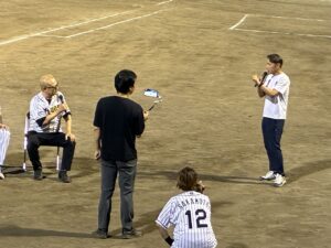 秋山監督は「難しい条件の中で実現した『栄光のバックホーム』は、福山の多くの方の協力なしには実現しませんでした」と感謝の言葉を述べ、橋本代表は「映画を通して、野球の魅力を再発見していただければ幸いです。我々は地元にスポーツパークを開設し、青少年スポーツの支援に役立つことを目的に活動をしております。今後もさらに『野球コミュニティ』を構築し、次世代の育成にも貢献したいと考えております」と抱負を述べた。