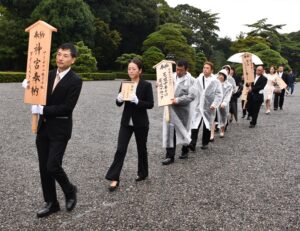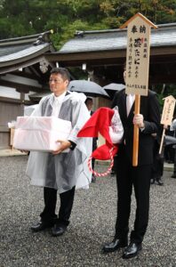 日本の最高神である天照大御神を祀る内宮への奉納には厳然としたルールがあるが、式典当日に内宮へ奉納することで、地域から献上された献饌(けんせん)のひとつとして各社自慢の商品を直接捧げる栄誉に浴することができる。