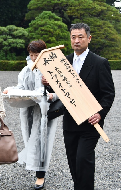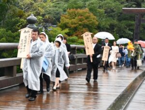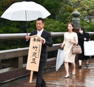 徳永製菓・上迫社長は「近鉄伊勢市駅から伊勢神宮・外宮へ向かう商店街内に2013年、㈱伊勢豆徳を立ち上げました。以来、伊勢神宮のご縁をいただいてまいりましたが、今日の内宮への正式奉納で気持ちも引き締まりましたし、ブランド力としても面白いと思います。また伊勢にもたびたび来ようと思います」、