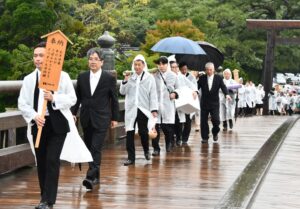広島県東部・岡山県の企業8社(㈱ハローズ・アイデアル㈱・キムチ美人本舗㈱・イトク食品㈱・㈱トワメイト・徳永製菓㈱・㈱島ごころ・尾道中華そばすみだ)は10月16日、〝農商工連携を目指すチーム渡邊〟「伊勢神宮奉納プロジェクト」に参加。伊勢神宮・内宮(皇大神宮)の「神嘗祭(かんなめさい)」に合わせて正式参拝を行い、各社自慢の逸品を奉納した。