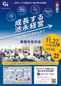 「池永経営グループ」は大手会計事務所「日本クレアス税理士法人グループ」(東京都千代田区霞が関3─2─5霞ヶ関ビルディング33階、中村亨代表社員、03・3593・3235)と10月1日経営統合し、「日本クレアス税理士法人福山本部・池永経営」(福山市王子町1─2─24、池永章会長、電084・931・1428)としてスタートした。11月27日〔木〕午前10時─午後5時、経営統合後初の「事務所見学会」(写真・参加無料)を開く。
