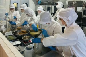 カフェ・クラウドキッチン・食品製造加工ラボのMARS LAB=マーズラボ(岡山市北区問屋町11―106、原卓也代表、電086・239・8981)はこのほど、山陽学園短期大学(同市中区)健康栄養学科の学生が開発した、「非常食」を想定したオリジナルカレーのレトルト加工に協力。同科3年コースの2年生7人が3月10日に同店を訪れ、商品化に向けて約200食分を製作した=写真上。
